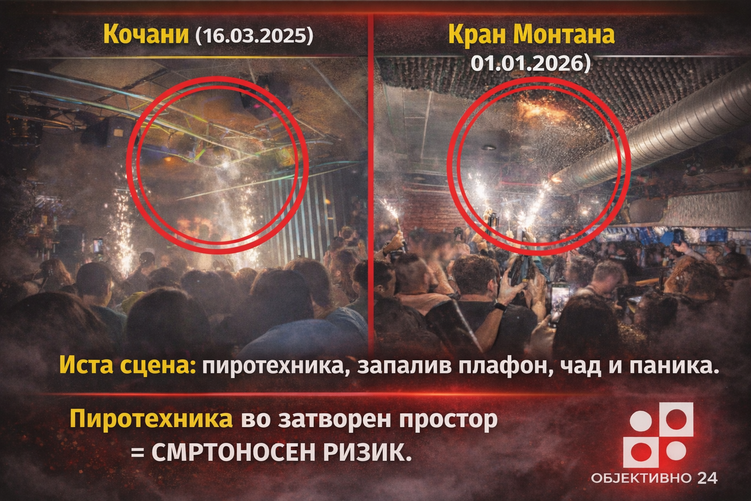 Бројот на луѓе не бил клучниот проблем — системските пропусти и лошите безбедносни стандарди биле. Последиците се речиси идентични: 47 загинати во Кран Монтана (со страв дека бројката ќе расте) и 62 во Кочани.