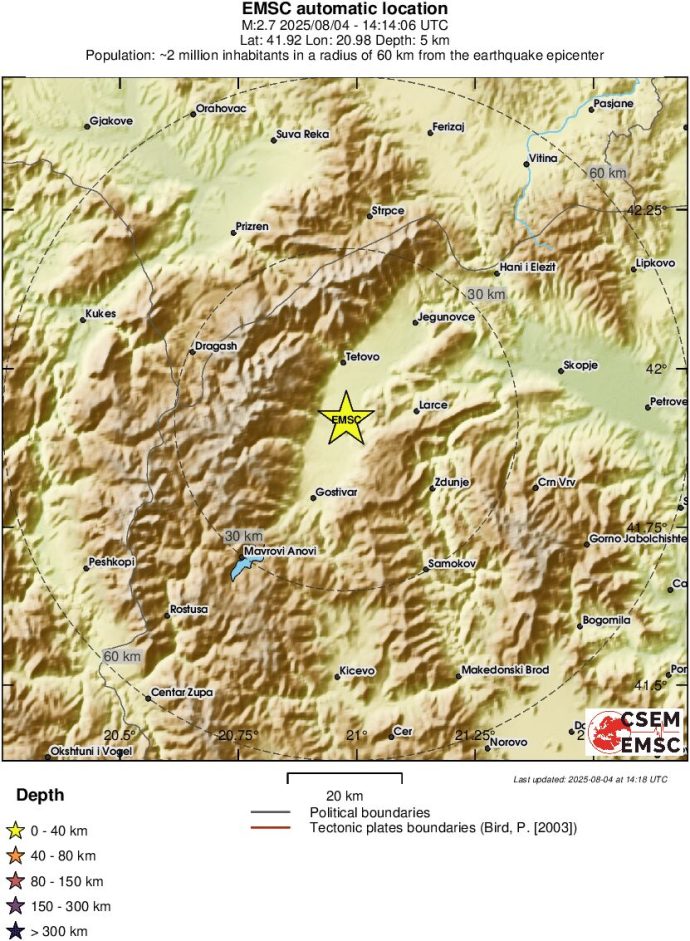 Земјотрес со јачина од 2,7 степени предмалку е регистриран во тетовскиот регион.