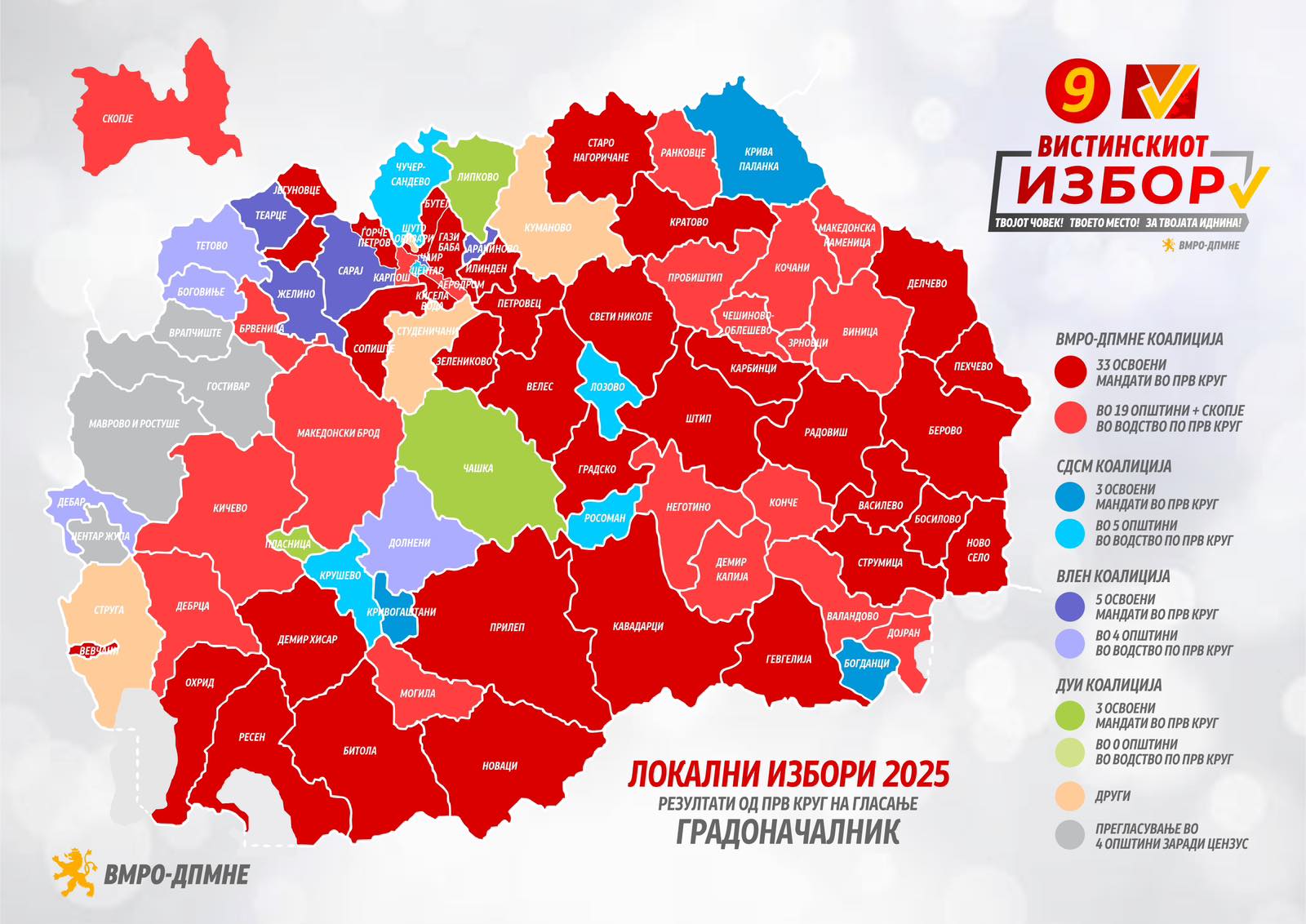 Можеме официјално да кажеме дека ВМРО-ДПМНЕ доби градоначалник во првиот круг во следните општини: